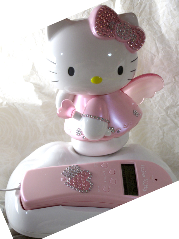 This is the cute kitty angel phone with extra bling. The phone has jewel embellishments on the handset and on kitty herself. The angel wings light up and flash when a call comes in. There is caller ID and number storage on the phone, but it is a corded phone. Sorry cordless peeps! It comes with an cord for power and just plugs in to your regular phone jack. So great! Another must have! 🙂 Click the photo to enlarge. 🙂