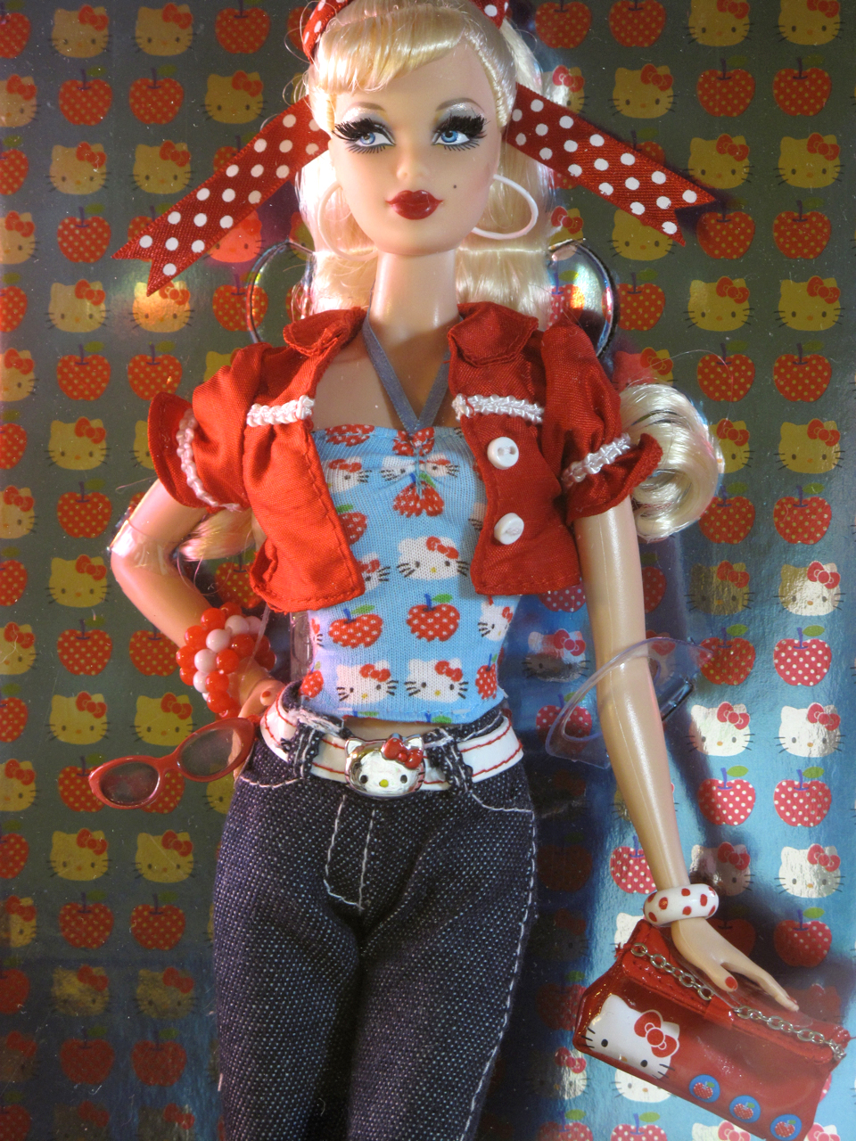 Watch out world! Here is Barbie all dolled up in a Hello Kitty outfit! I don’t know what to say, except that I think she looks fantastic! I also took a picture of her close up, so you can really see the outfit, but you can always click on the images to make them larger too! 🙂