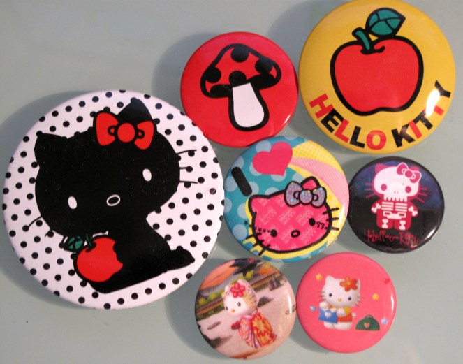 Here’s a picture of a few of the Hello Kitty buttons that I have. I may have a couple more floating around on clothes and stuff, but I can’t find them at the moment. Anyway, they are fun to wear and they turn any plain old outfit into a HK outfit! lol. I think my favorite is the skeleton kitty that I got from a friend in the UK. 🙂 Click the pic to enlarge. 🙂