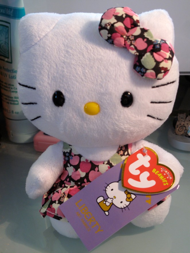 My friends are always spoiling me! I got this adorable Hello Kitty from my friend Robert who lives in Scotland! She is wearing a dress and bow that have apples and kitties on them in pale green, pinks and cream with a brown background. What a lovely gift! 🙂