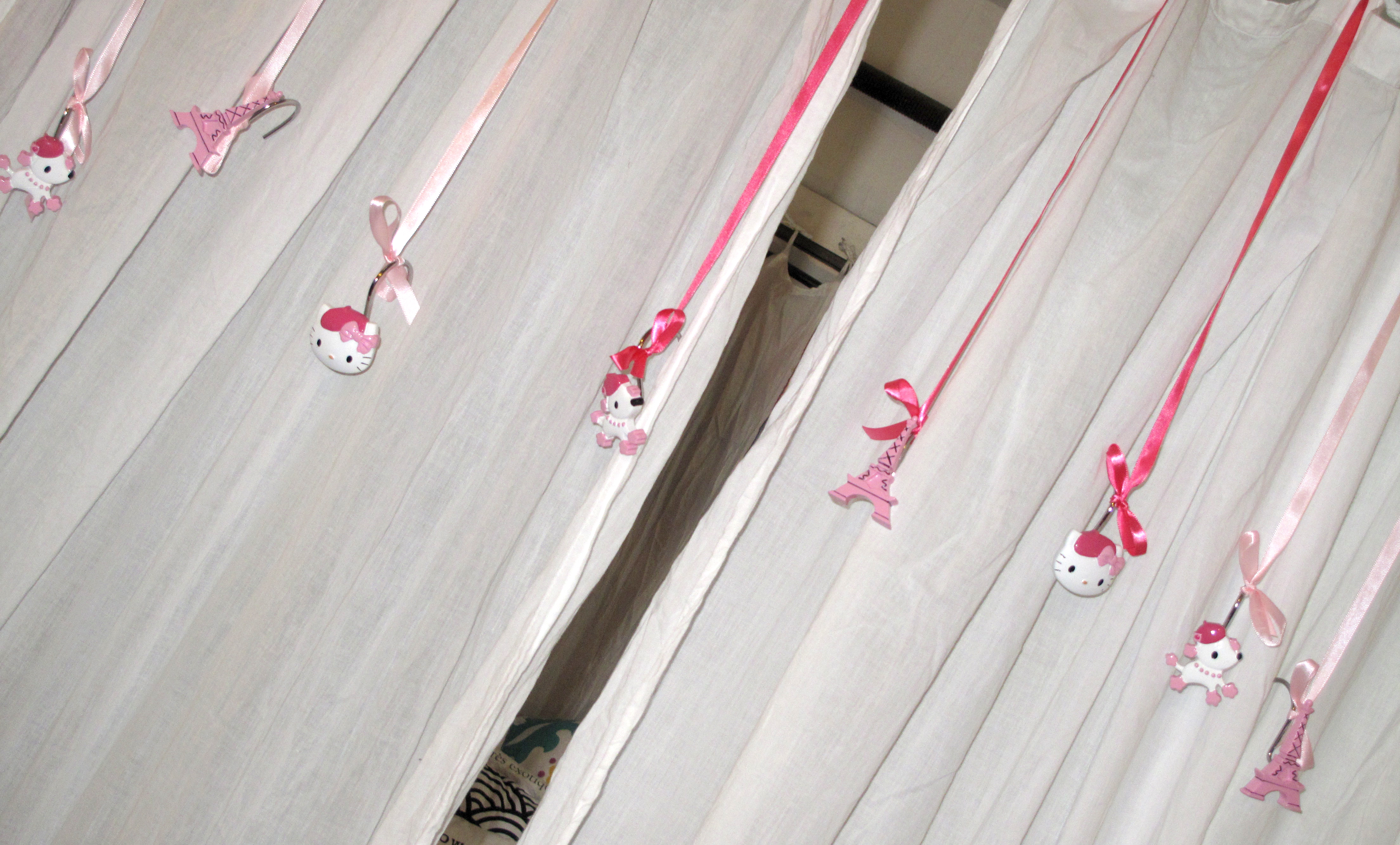 I just got these supercute Hello Kitty shower curtain hooks from Babies-R-Us online. Well, I don’t have a shower curtain, because our showers have doors, so I decided to try out the hooks hanging from my bed. I might change it up, but I thought I’d share. These hooks are really cute and affordable too! Here are two views: a close up and a wider shot of my bed.