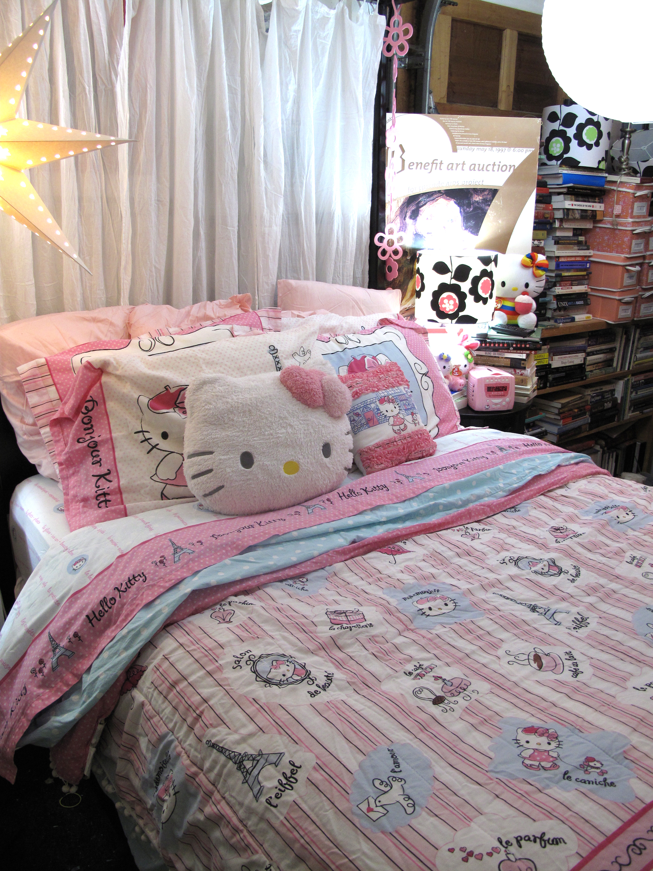 I just got these supercute Hello Kitty shower curtain hooks from Babies-R-Us online. Well, I don’t have a shower curtain, because our showers have doors, so I decided to try out the hooks hanging from my bed. I might change it up, but I thought I’d share. These hooks are really cute and affordable too! Here are two views: a close up and a wider shot of my bed.