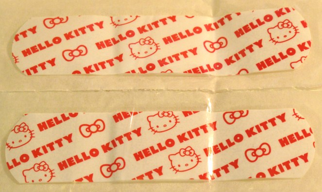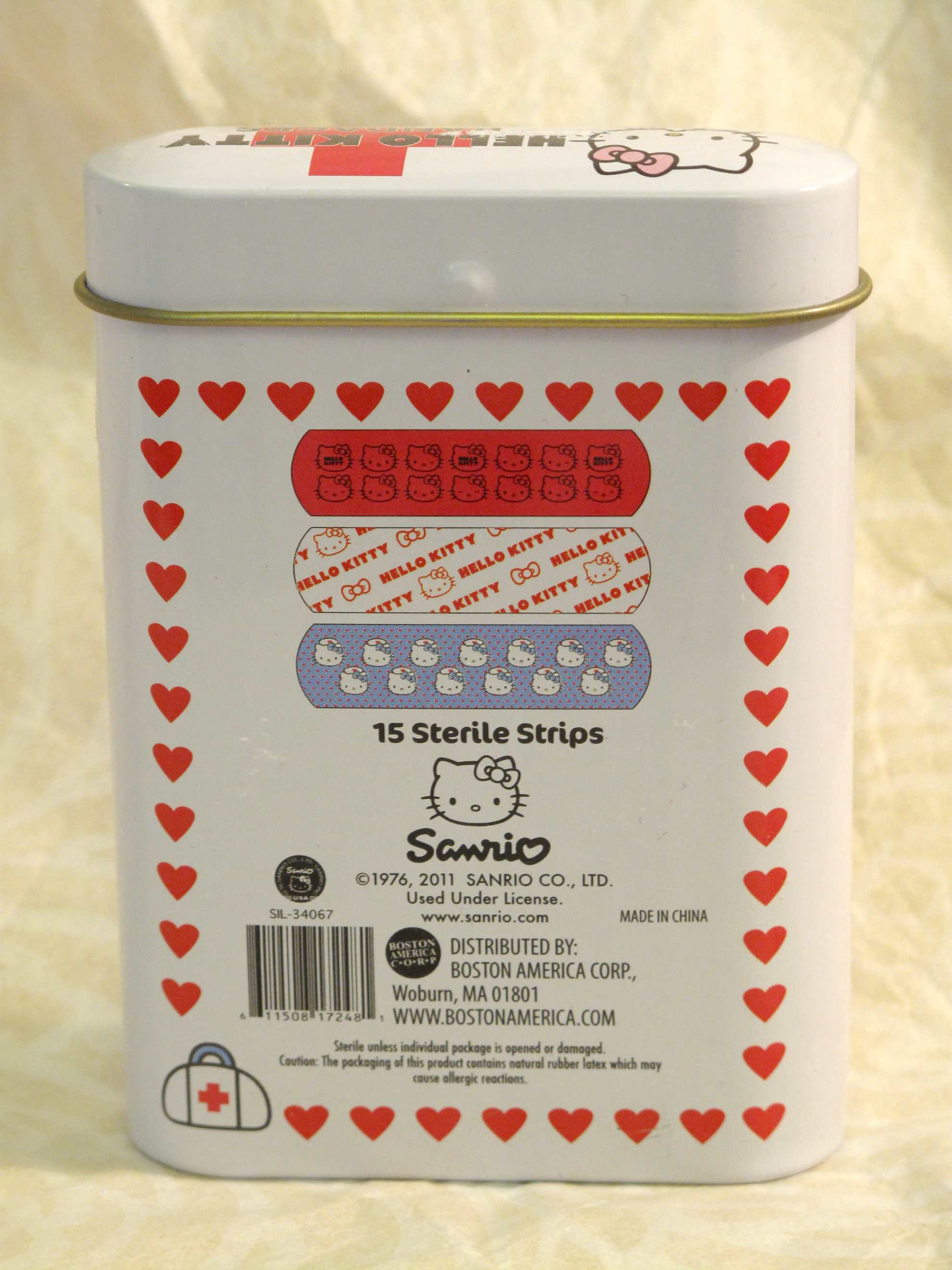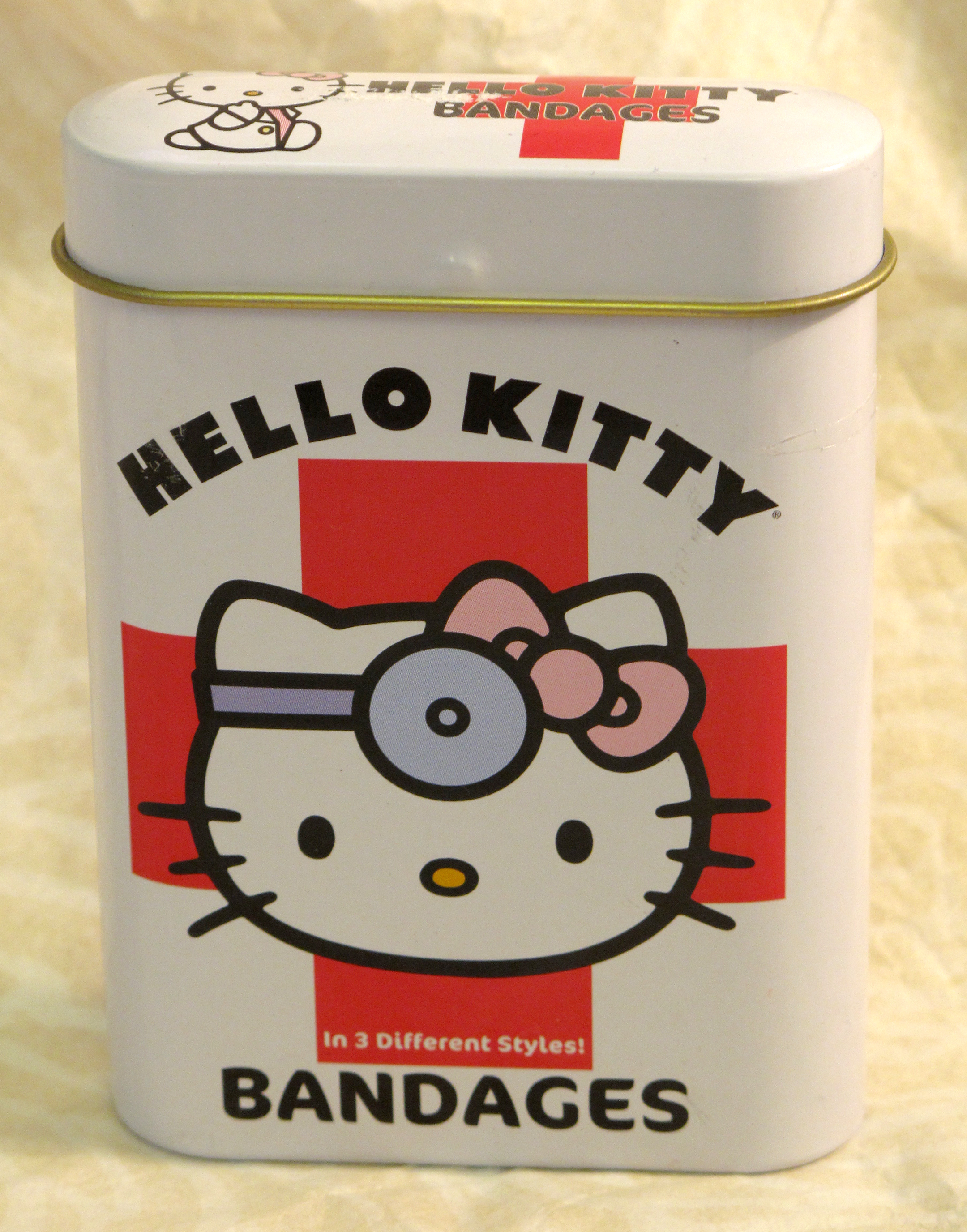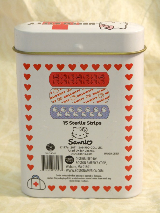 Last year I posted about a different set of Hello Kitty bandages here. I got this new set at the end of last year too, but I’m just now posting about it. It is a cute tin with a Red Cross look and Hello Kitty as a medic of some kind. The bandages come in three varieties: red, white and blue. My favorite are the blue ones! And when I use up all of the bandages I will still have the cute tin! Super! Click the pics to enlarge. 🙂