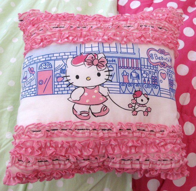 I got this beautiful and frilly HK pillow a number of years ago to go with my HK Parisian comforter and sheet set. I think I may have gotten it from Target, but unfortunately, they don’t have them any more. 😦 Boo! The reverse side is just plain white, but the front side has these wonderful frilly pink parts and the cute Hello Kitty Paris scene! Magnifique! Très Belle! Click the pic to enlarge. 🙂