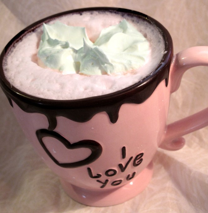 Here are the results of my pink Hello Kitty hot chocolate making! I made it with milk, so it is a pretty light pink, but pink nonetheless! The taste is kind of hard to describe. lol. So in case you were wondering what pink cocoa might look like, here it is! Click the pic to enlarge. 🙂