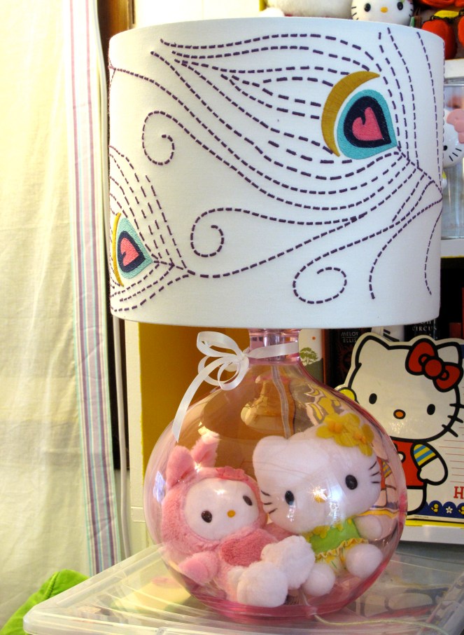 I just realized that I could stuff things into the base of my lamp, so of course I had to put some Hello Kitties in there! I think they look awesome! Don’t worry, they have air to breathe! hahaha. Oh, I got the lamp base at PBTeen.com a long time ago. They don’t sell this particular one anymore, but they have other cute ones. 🙂 Note: I just added the second picture of my lamp updated. I got a new lamp shade from PBTeen! 🙂 The shade is currently for sale HERE.