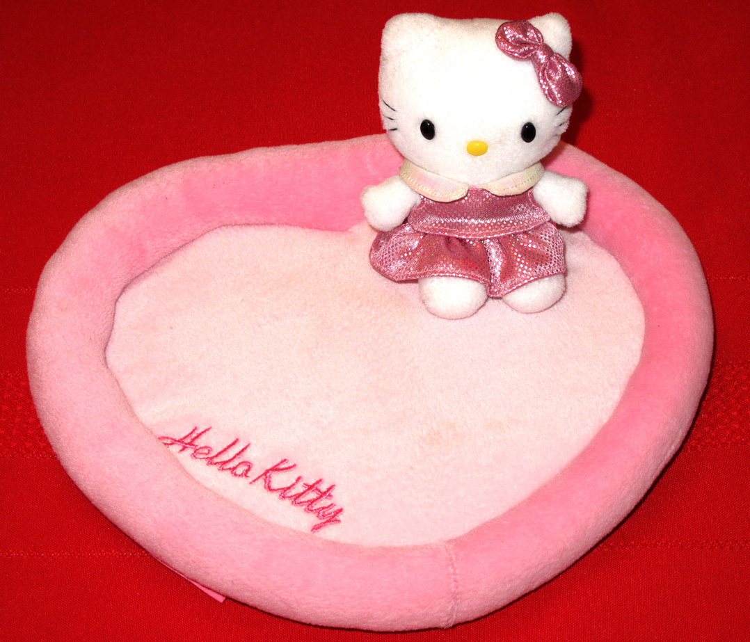 There are a lot of great accessories for the car out there with Hello Kitty on them. One accessory that I’ve had for awhile now is this heart shaped pad that can be a landing spot for the stuff in your car. Throw your cell phone on or slips of paper or loose change. Kitty will look after them for you! I put this on the dashboard of my car (passenger side) and it is nice being able to see this cute Hello Kitty riding along with me. I love the pink and white dress she is wearing too!