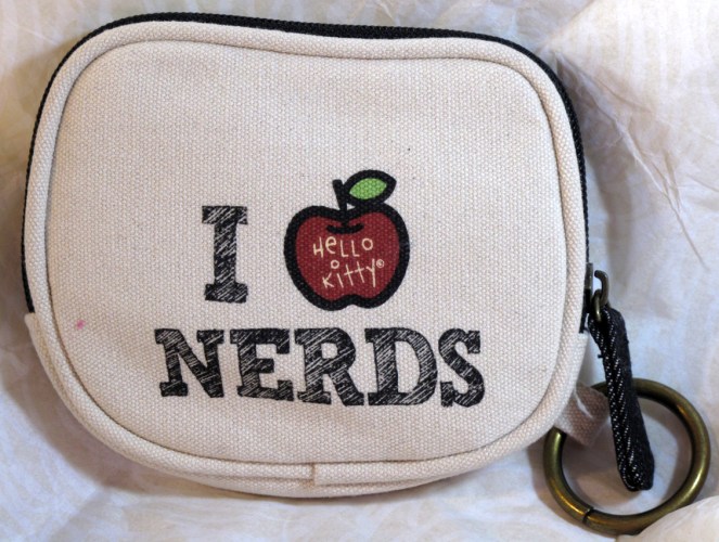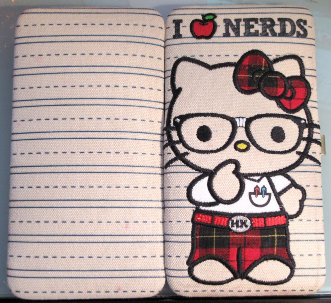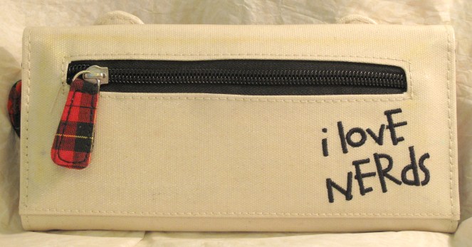 As you may be able to tell from my posts, I love the HK Nerd product line! I got this HK I Love Nerds hinge wallet a while ago from Loungefly, but I don’t think they carry this particular wallet anymore. This is a great little wallet. It doesn’t have a place for checks, but since I don’t really use checks, that is okay with me. It has spots for cards and two different zipper compartments and one other pocket. I can actually fit quite a lot of stuff in it and it snaps shut. I’m including pics of what it looks like closed and what it looks like on the inside and folded open. Click the pics to enlarge. 🙂