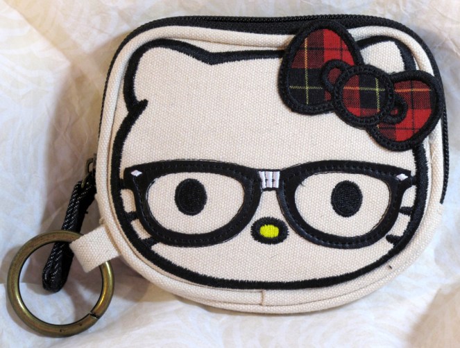 Yay for Nerds! Another item from the HK Nerds series by Loungefly is this Nerd Clutch/Pouch. It is just big enough to carry things like contact lens cases and a tiny bottle of solution or a fold up toothbrush or maybe your money! The inside is lined with plaid and the outside has a ring so you can hook it to other things or hang it up. Kitty is showing off her nerd look with her glasses on the front and on the back it says “I ❤ Nerds” only with an apple instead of a heart! You gotta love Nerd Kitty!!!